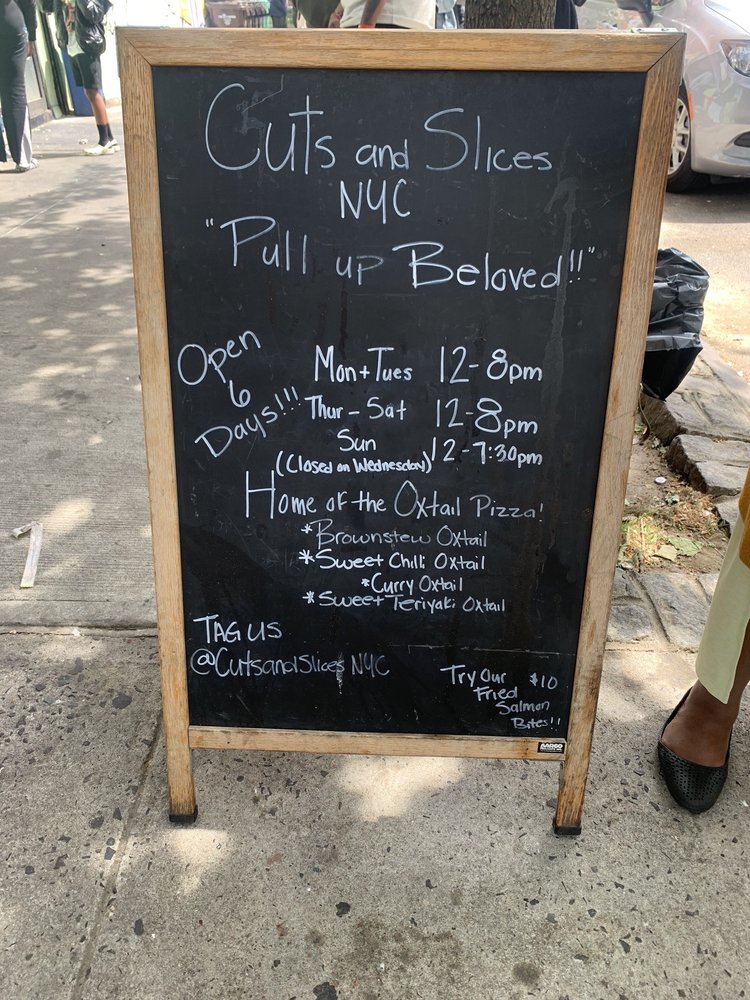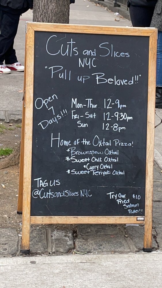“ I've been to NY on several occasions but this was my first trip experiencing Brooklyn and I couldn't depart without getting a full experience. I had seen the viral Sweet Chili Oxtail pizza at Cuts & Slices on social media and I love oxtail so I couldn't wait to try it on their pizza! Upon arrival, there was a line of people outside waiting on their orders. It started raining a bit and I noticed that there wasn't any in door seating or waiting area, but thankfully I anticipated the rain and had an umbrella that day. After placing my order, there was approximately a 20-30 minute wait which wasn't a long wait time for me. I ordered one slice of the Sweet Chili Oxtail pizza and one slice of the Teriyaki Oxtail pizza. I liked both but I didn't taste a strong distinction in flavors between the two. Although they were both good, I couldn't finish them because I became full relatively quick. If you visit, I'd bring a little bit of patience and a bit of an appetite. Overall, it was a good experience. ”