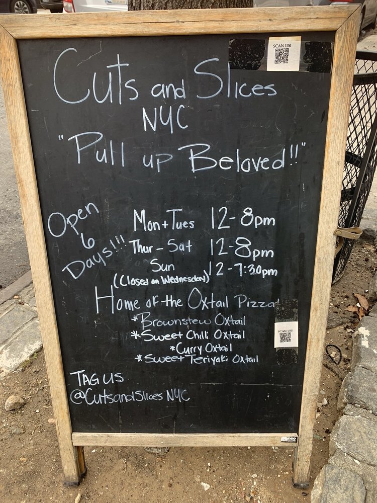 “ What a difference a year makes! I finally tried the OG Cuts and Slices shoppe # 1 in Brooklyn on Howard Avenue. This small business has the same owner as the Queens #2 location. On an early Saturday morning I found parking right outside, there were two people whom already ordered ahead of me. There was no long line around the block as reported in 2023. The slices were excellent quality, the oxtail plain was surprising tastier than the ox with chili oil, had crispy crust for you Portnoy rating fans. Served with courtesy and class. Eat carefully because sometimes has a small bone in the oxtail. Let me not understate how delicious the oxtail is. It is cooked to perfection for hours with all of the spices blended in. It is like having a stew pizza. So delicious! Yeah it's $12 a slice, but you pay for labor and quality. ”